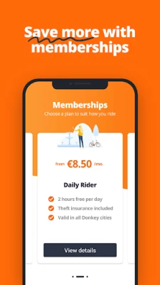 With a Donkey membership, you pay a fixed monthly fee and get a certain amount of free time per day. If you exceed the included daily free time, your rental is extended for a low fixed cost. Ideal for the daily commute and for a busy city life with multiple errands throughout the day. Valid in all Donkey cities.